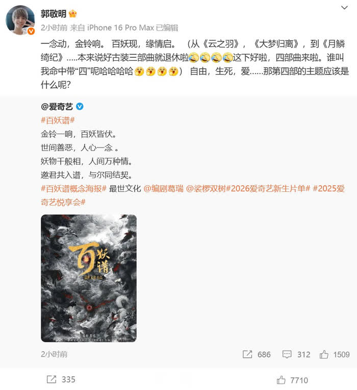 9月25日策略池,2025 爱奇艺悦享会发布 2026 新生片单,人气 IP《百妖谱》宣布真人影视化,概念海报同步亮相。随后,郭敬明转发相关内容。