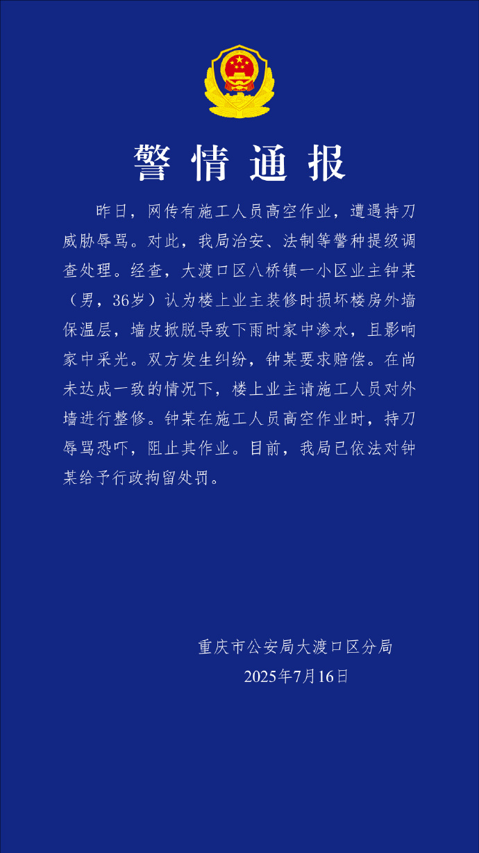 昨日,网传有施工人员高空作业,遭遇持刀威胁辱骂。对此,我局治安、法制等警种提级调查处理。经查,大渡口区八桥镇一小区业主钟某(男,36岁)认为楼上业主装修时损坏楼房外墙保温层,墙皮掀脱导致下雨时家中渗水,且影响家中采光。双方发生纠纷,钟某要求赔偿。在尚未达成一致的情况下,楼上业主请施工人员对外墙进行整修。钟某在施工人员高空作业时,持刀辱骂恐吓,阻止其作业。目前,我局已依法对钟某给予行政拘留处罚。
